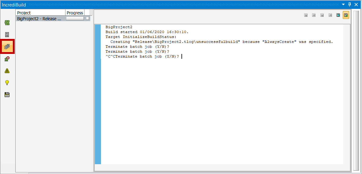 The progress and output of your builds are displayed in the Incredibuild Build Monitor inside Visual Studio .