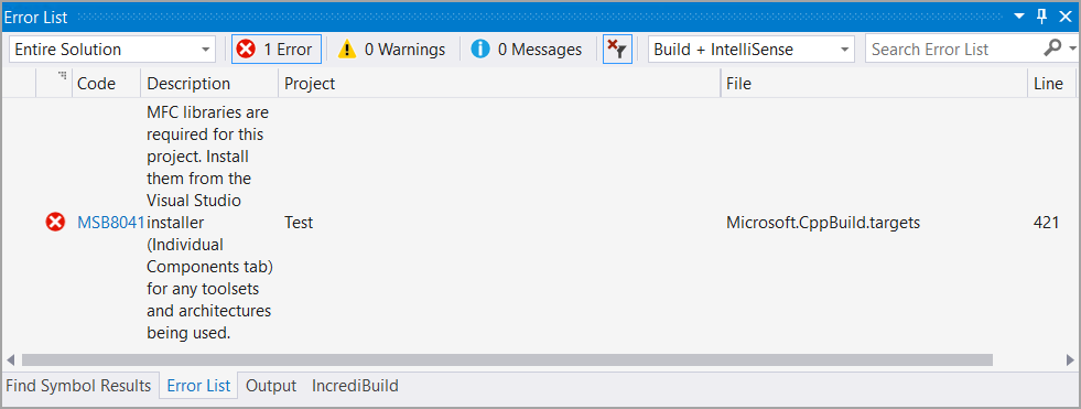 The Error List is populated with the results of the build and displays a filtered view of the build errors. This allows for easy navigation to the source code.