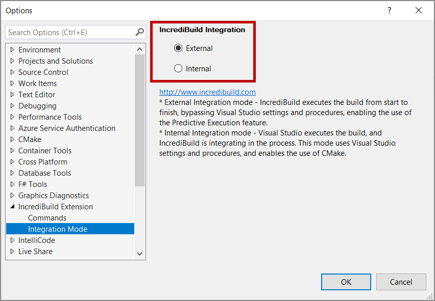 In External mode, Incredibuild fully controls the build process and executes it from start to finish, bypassing Visual Studio settings and procedures. Although Incredibuild is activated from Visual Studio, its operation is external to Visual Studio native processes. Prior to Incredibuild version 9.5.0, this was the only mode. The initiation of builds in External mode does consume additional memory, and the initialization time is a fraction slower.