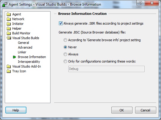 - According to 'Generate browse info' project setting – THe C/C++ page in MSVC's Project Settings dialog defines whether .SBR files are generated when compiling. This setting causes Incredibuild to create browse information only if the 'Generate browse info' Project Settings option is selected. Note that the 'Build browse info file' setting (found under the "Browse Info" page in the project settings dialog) does not affect Incredibuild's behavior in any way.
