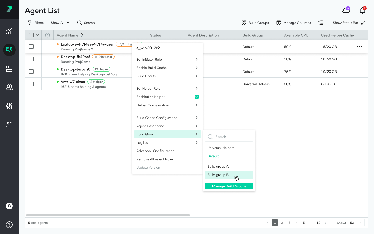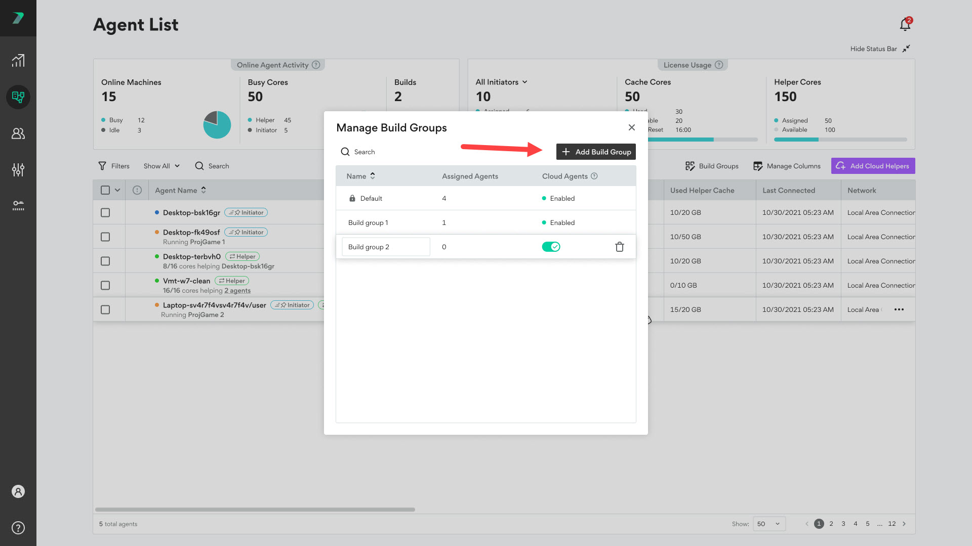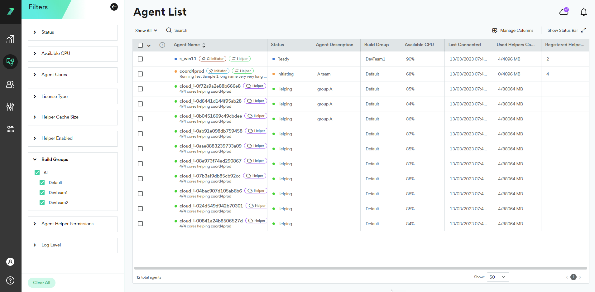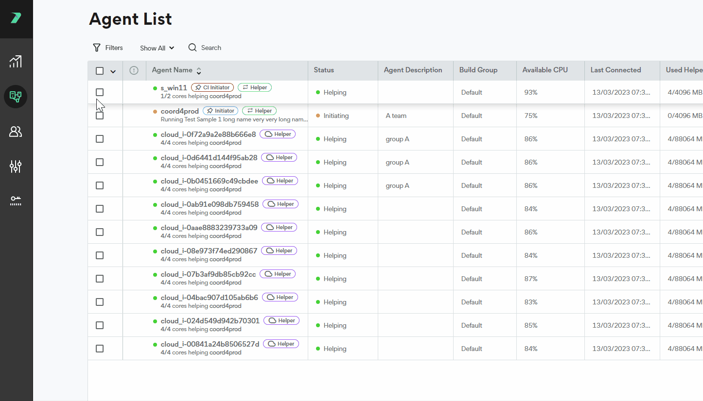 Build Groups allow you to limit build distribution to a select group of Agents. Each Build Group includes Initiator Agents and Helper Agents. By default, every Agent is assigned to the Default Build Group. You can assign an Agent to a different Build Group in the Coordinator's Agent List.