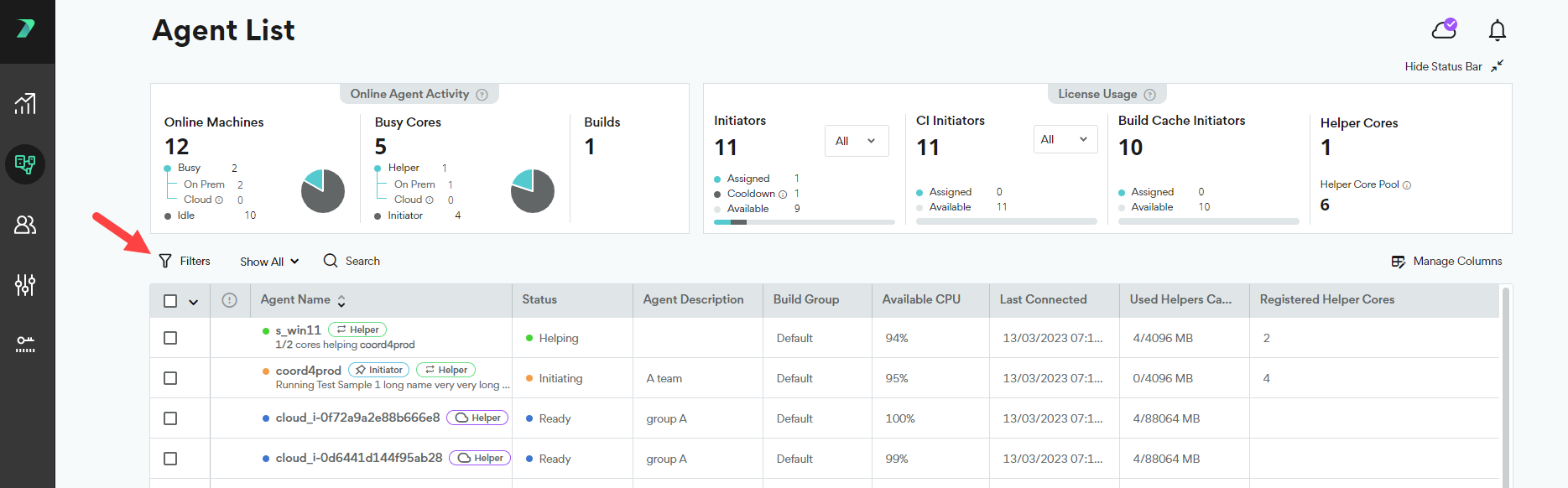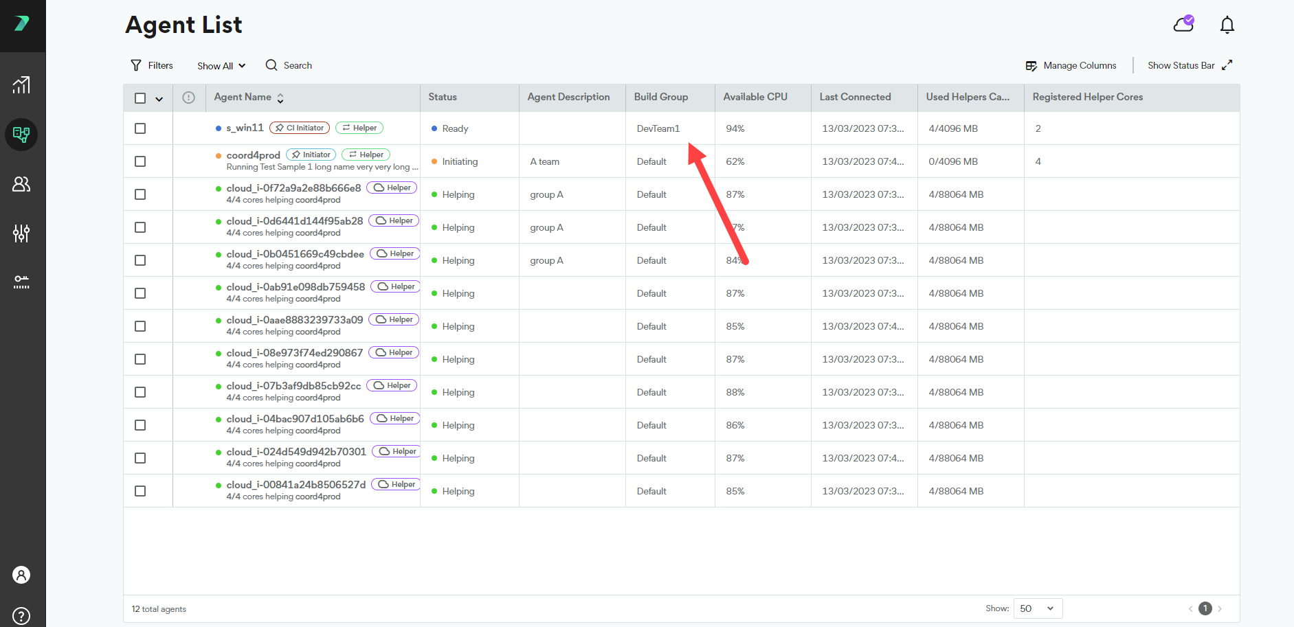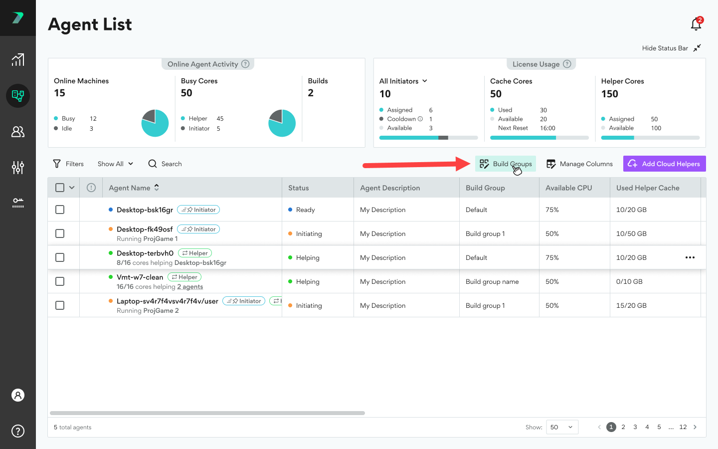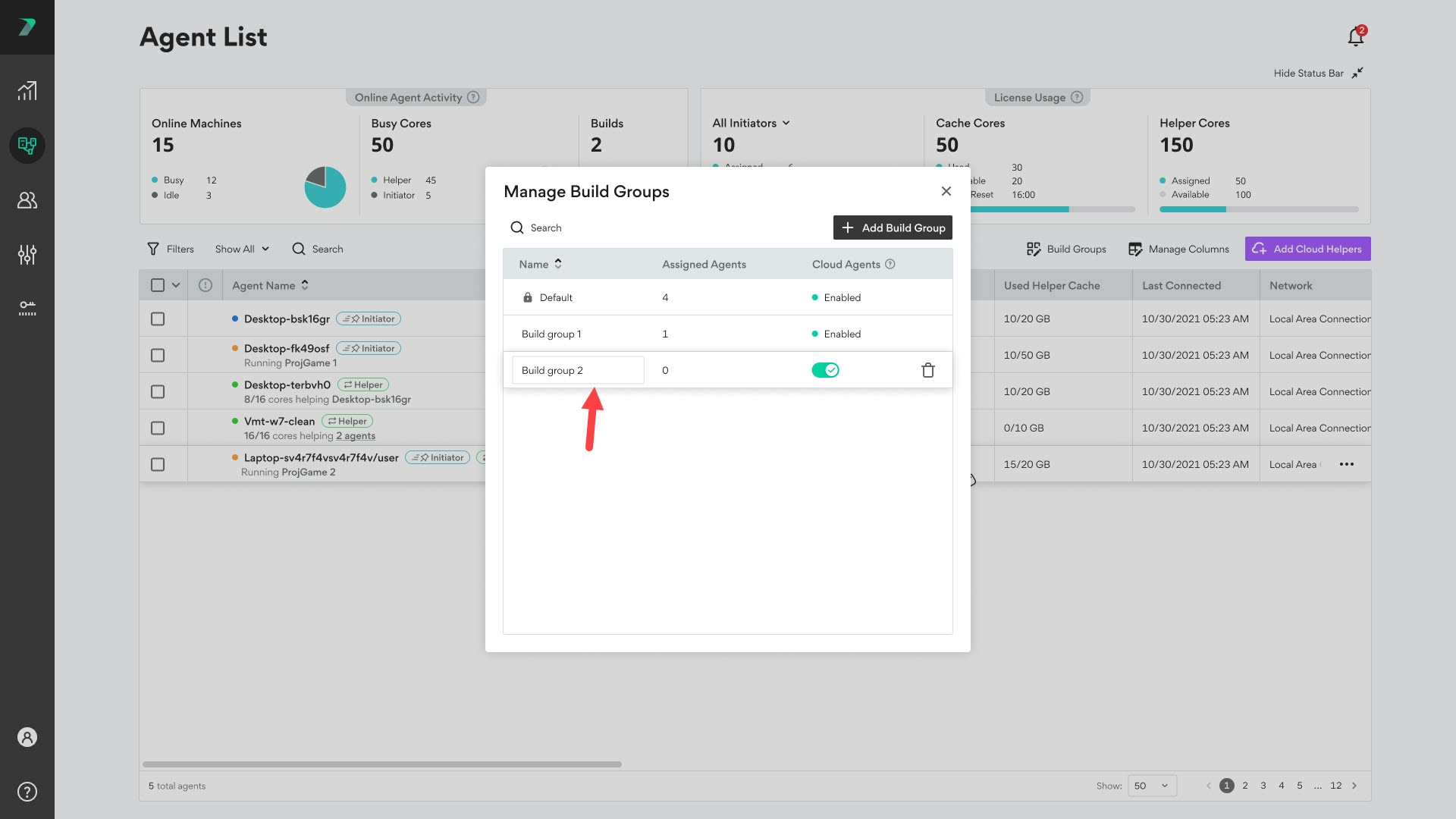 Build Groups allow you to limit build distribution to a select group of Agents. Each Build Group includes Initiator Agents and Helper Agents. By default, every Agent is assigned to the Default Build Group. You can assign an Agent to a different Build Group in the Coordinator's Agent List.