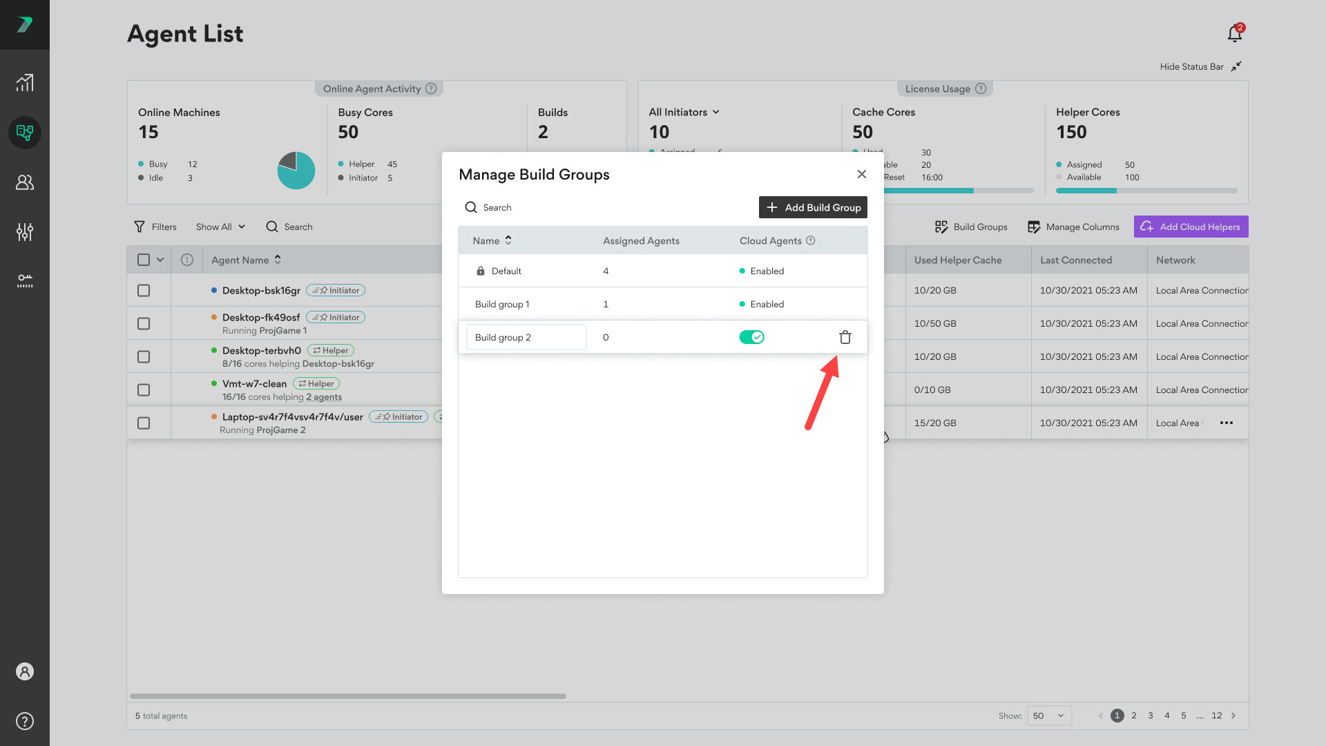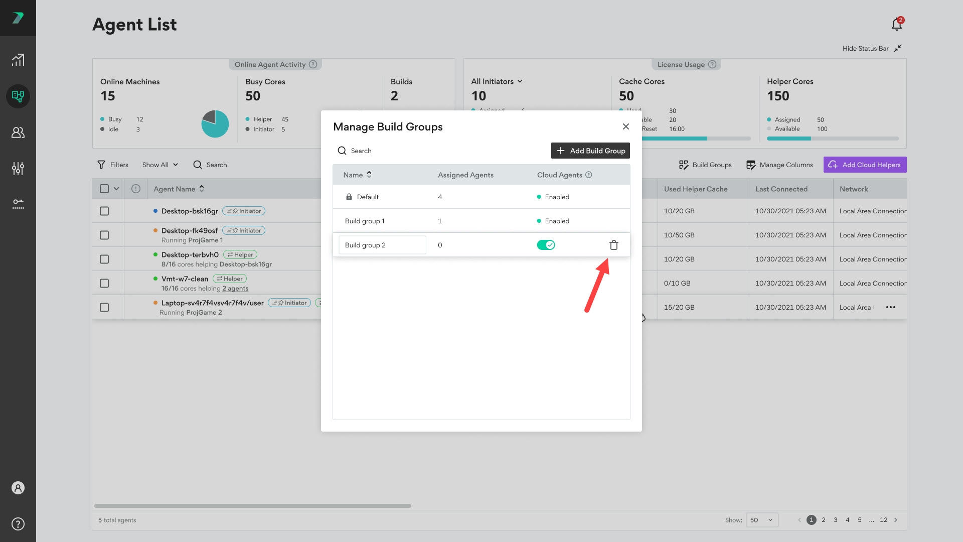 To delete an existing Build Group, click Build Groups and use the trash button next to the Build Group you want to delete.