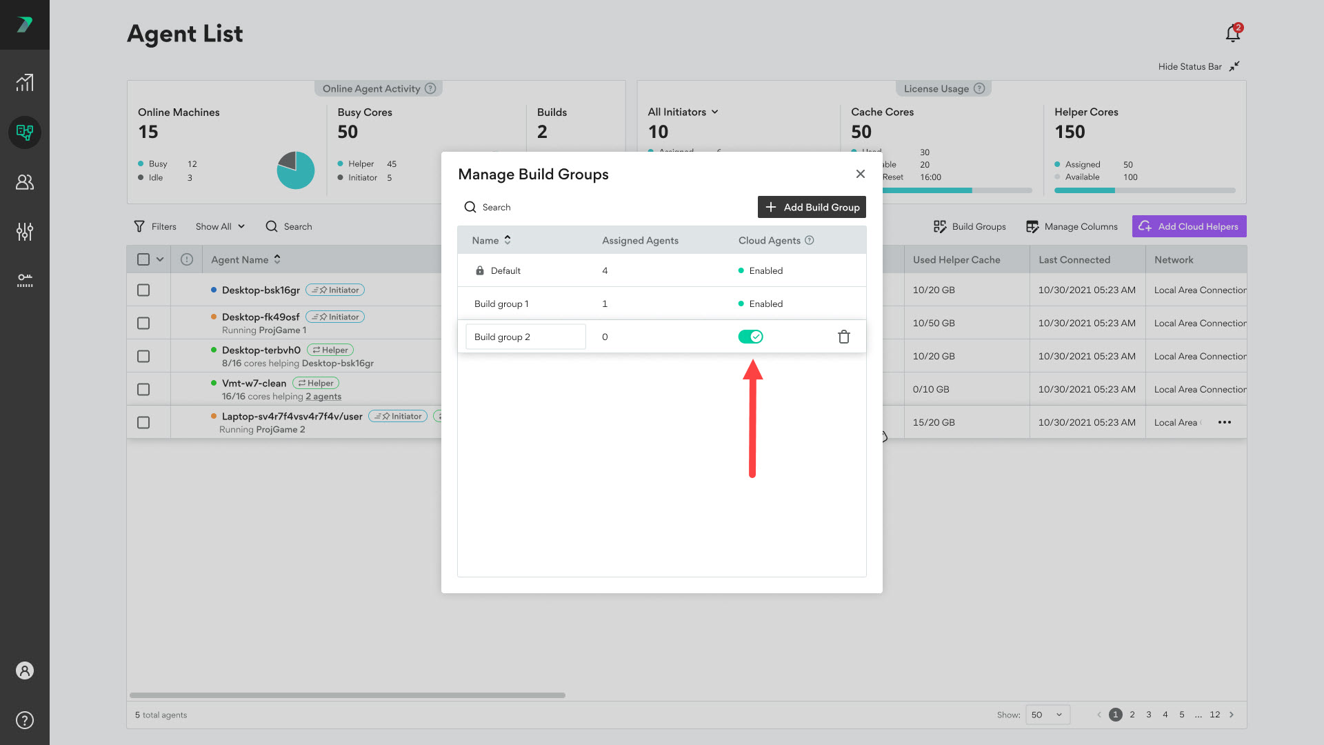 When you scale Incredibuild to the cloud, you enable Incredibuild to create and use Incredibuild Agents in your cloud provider. To allow you to better manage these resources, you can define when the Initiator Agents in a Build Group can use your Cloud Helper Agents or not. By default, this setting is enabling allowing all of your Initiator agents to use your Cloud Helper Agents.