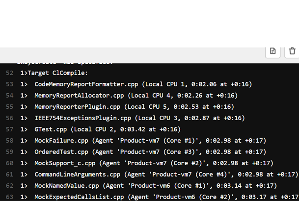 You can verify that connected helper agents are participating in the build process during a build in the command prompt. You will see which machine is running each task in parentheses as seen in this example: