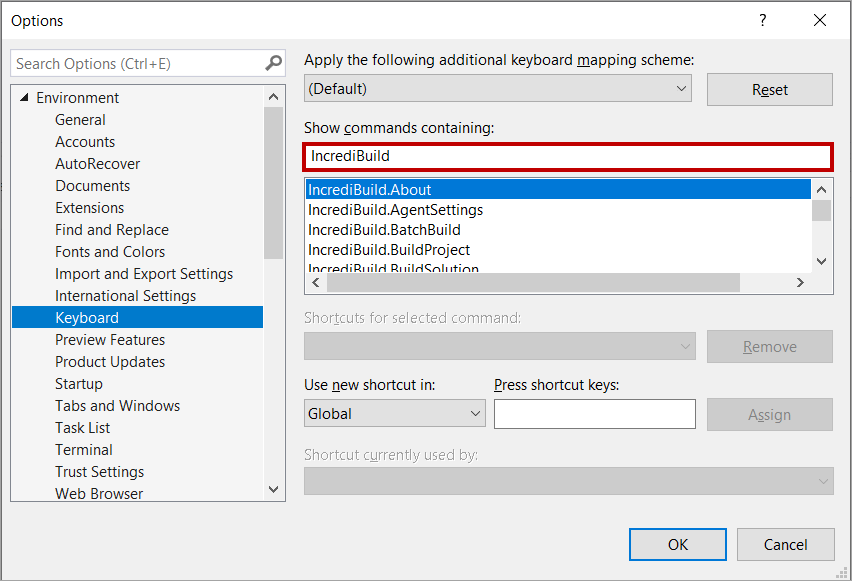 To add keyboard shortcuts to Incredibuild commands (use this to override standard Visual Studio keyboard shortcuts, for example, by setting F7 to start an Incredibuild build, or CTRL-F7 to compile the currently edited file):
