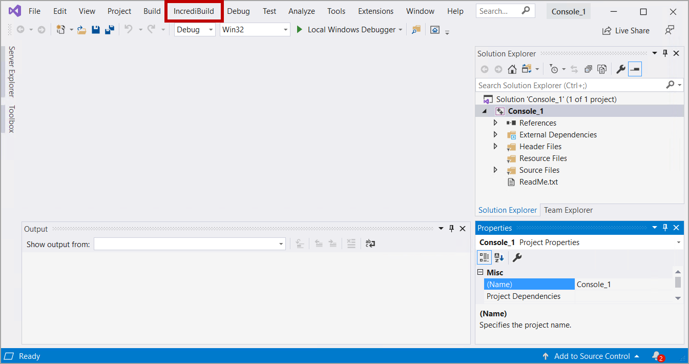 To add commands to the Incredibuild toolbar, click Add Command, select Incredibuild from the Categories list and then select the commands to add to the toolbar, and click OK.