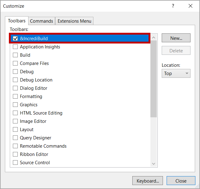To customize the Incredibuild toolbar, go to Tools > Customize > Commands, and then from the Toolbar dropdown, select Incredibuild.