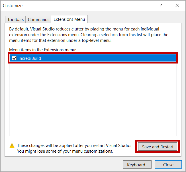 To enable the Incredibuild menu, in Visual Studio, go to Tools > Customize > Extensions Menu, select Incredibuild and then click Save and Restart.
