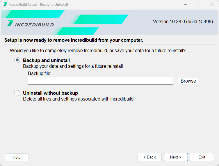 Open Control Panel > Programs > Uninstall a program, and remove the Incredibuild application. Select whether to Backup and uninstall, or Uninstall without backup. If you select to make a backup, click Browse to specify the name and location of the backup file.