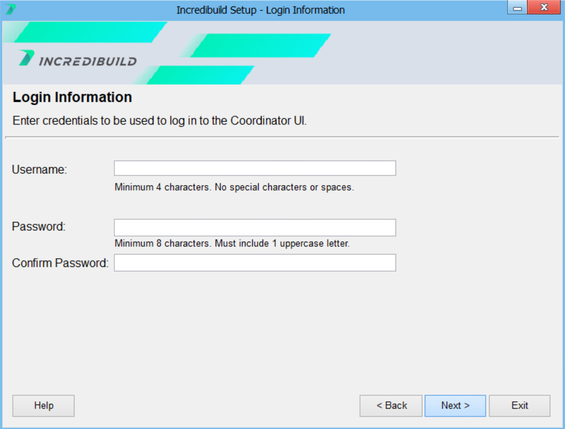 Enter a username and password that will be required for future access to the Coordinator user interface. The password must be at least 8 letters with at least one capital letter.