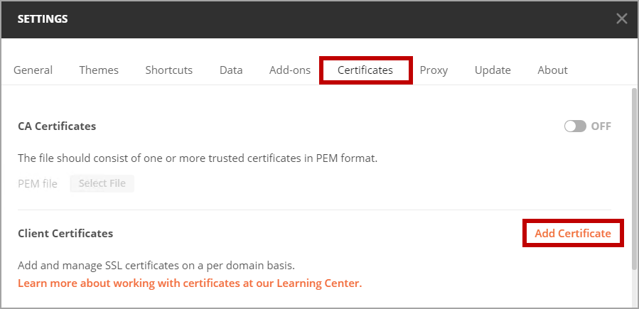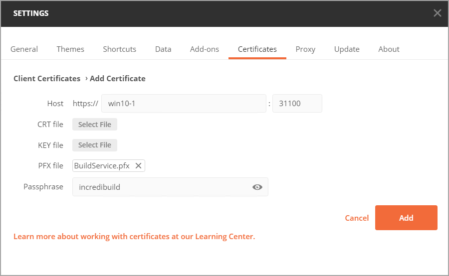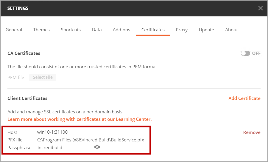 After you have imported the Incredibuild self-signed certificate, you need to add this certificate to your API Client tool, in order to send your API requests in a secured way over HTTPS protocol.