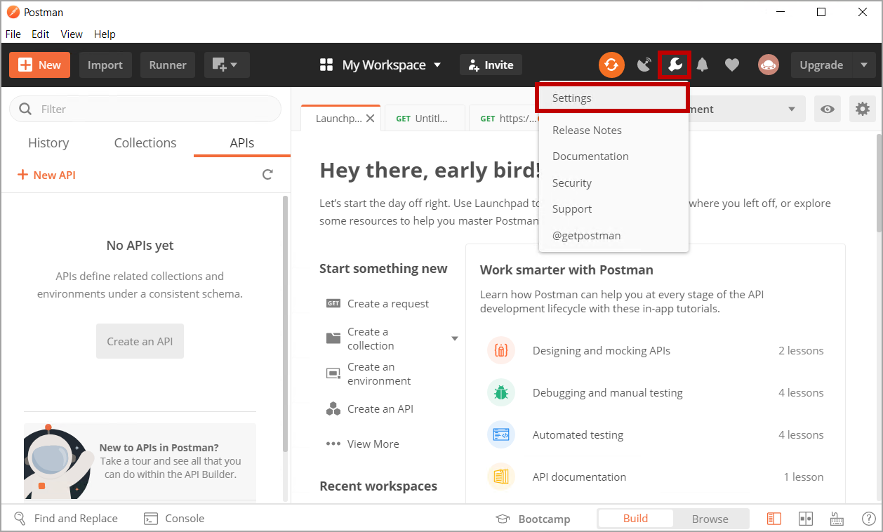 On Postman API Client interface, click the Settings wrench button on the header toolbar and then select Settings.