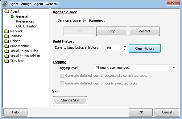 Use the Agent Service Start, Stop, or Restart button to start, stop, or restart the Incredibuild Agent Service ("BuildService.exe"). This section also displays the current status of the Incredibuild Agent Service (either "Running", "Stopping", "Stopped", or "Starting").
