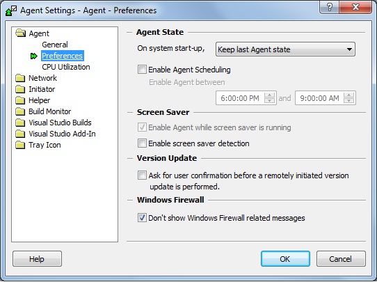 Determines whether the Agent detects screen saver activity. When this feature is used, screen saver CPU activity is considered idle CPU activity, improving the Agent's chances of getting assigned to remote builds. Furthermore, the following changes in behavior take effect during screen saver activity:
