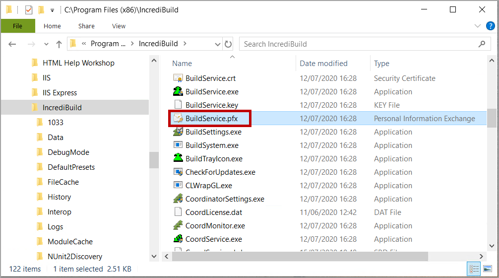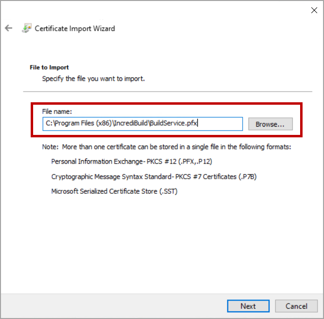 On the Coordinator machine, in File Explorer, double-click on the BuildService.pfx file (located in install_dir\Incredibuild).
