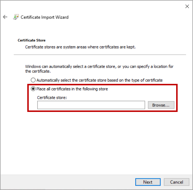 Select Place all certificates in the following store and then click Browse.